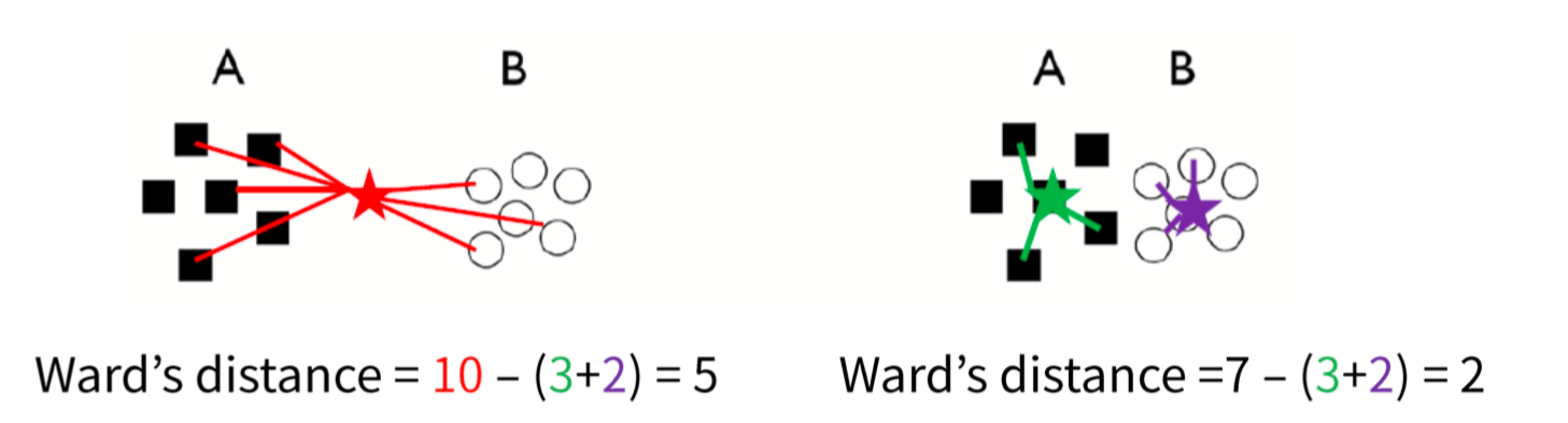 - ward ( 두 군집 간 제곱합 - (군집 내 제곱합의 합) ) : 병합되었을 때, 증가되는 변동성 양을 기준으로 하는 방법