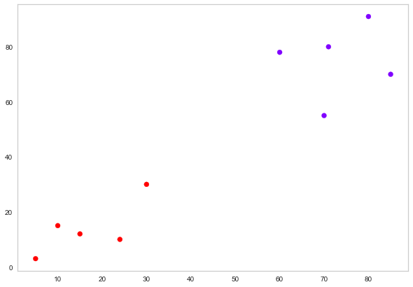 plt.scatter(x=X[:,0], y=X[:,1], c=cluster.labels_, cmap='rainbow')