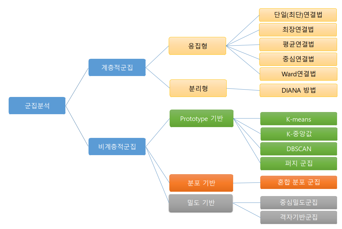 - 데이터 간 유사성 측정해서 상호 유사성이 높은 대상을 동일 집단으로 분류하는 기법