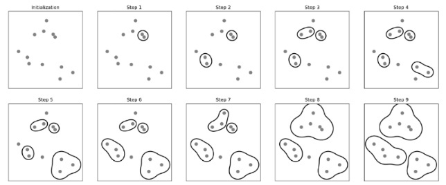 - 모든 샘플이 각자 하나의 클러스터로 시작 > 조건 부합 > 서로 병합 > 반복 > 종료조건 도달까지 군집 커짐