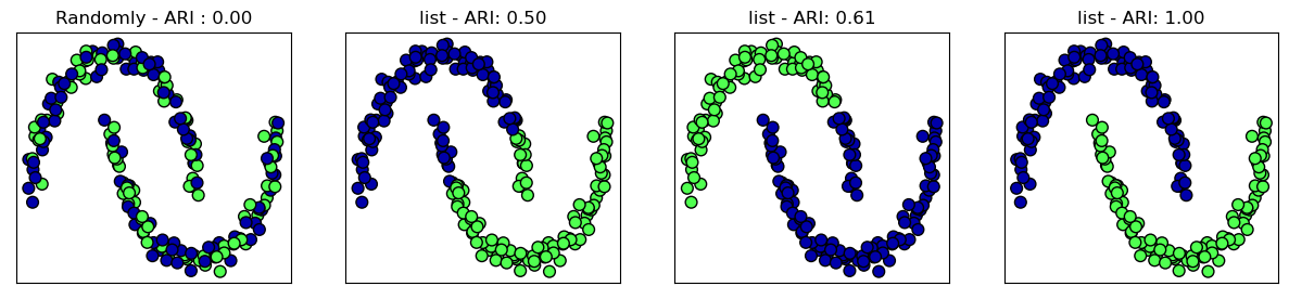 axes[0].set_title("Randomly - ARI : {:.2f}".format(adjusted_rand_score(y, random_clusters)))