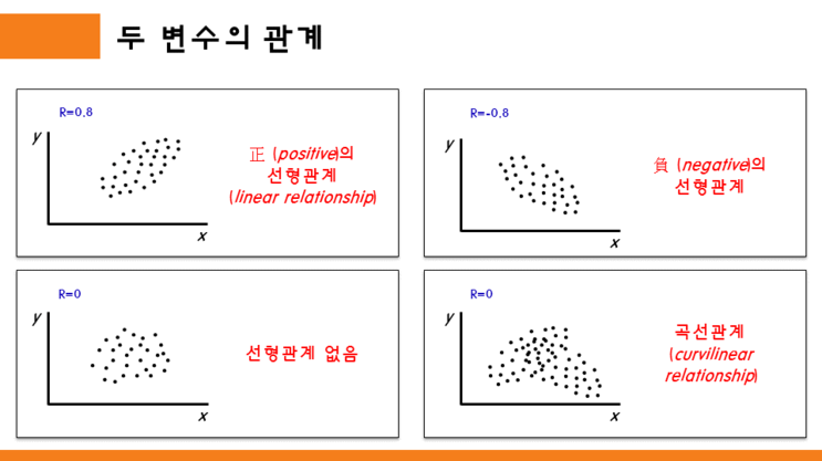 - 수치형인 두 변수 간의 관계를 분석 하는 방법론