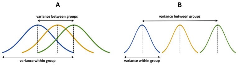 >> 집단간분산(variance between groups) / 집단내분산(variance within group) 기반의 F분포를 이용