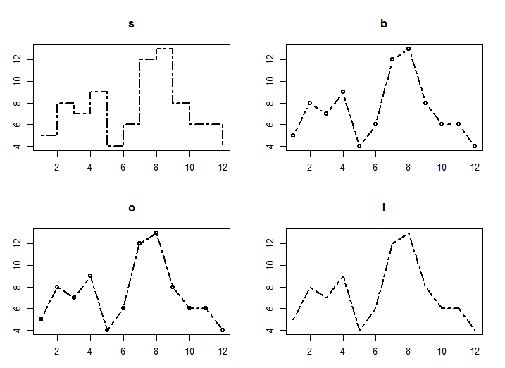 plot(month, late, type="s", lty=6, lwd=2, xlab='Month', ylab="Late cnt", main='s')