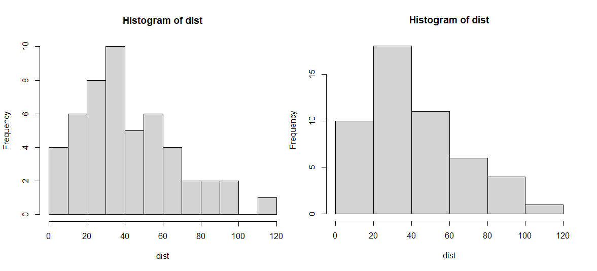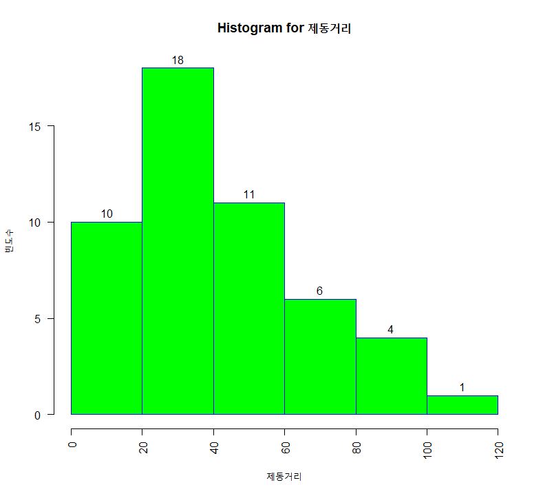 h <- hist(dist, main="Histogram for 제동거리", xlab="제동거리", ylab="빈도수",