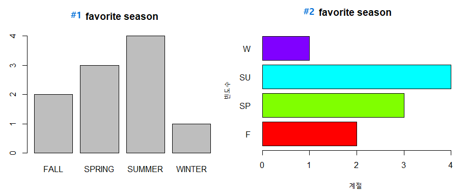 barplot(ds, main='favorite season', col=rainbow(4), xlab="계절", ylab="빈도수",
