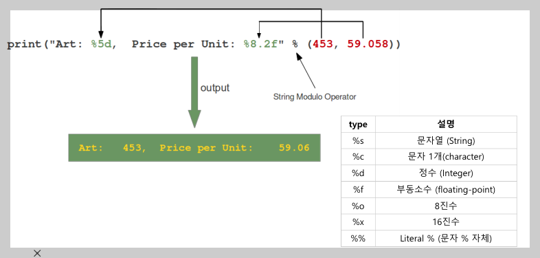 - “%datatype” % (variable) 형태로 출력 양식을 표현
