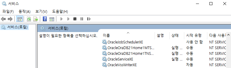 - OracleServiceXE (XE = instance 이름, db 이름)