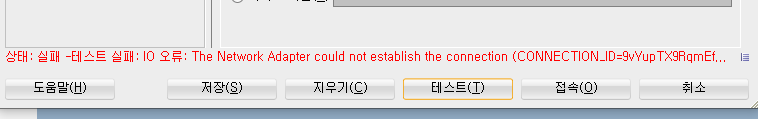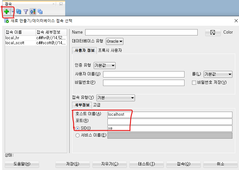> 위의 [cmd> lsnrctl status] 에서 호스트 이름, 포트번호, SID에 확인 정보와 일치 하는 지 확인 후 테스트&접속
