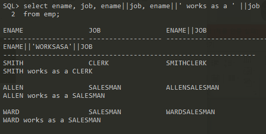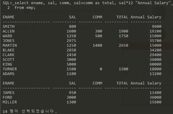 select ename, sal, comm, sal+comm as total, sal*12 "Annual Salary"