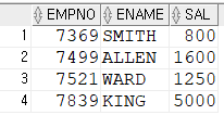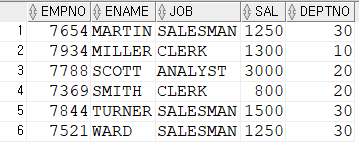 SELECT empno, ename, job, sal, deptno