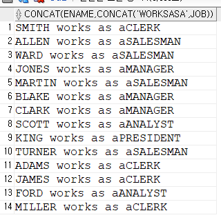 SELECT concat(ename, concat(' works as a', jol))
