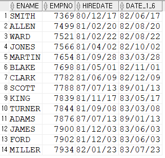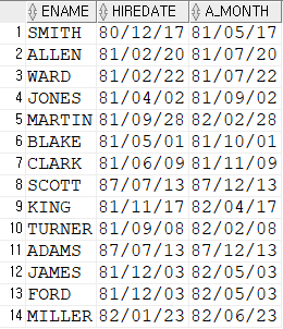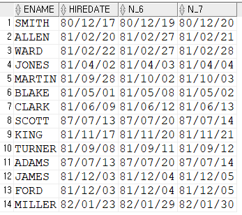 SELECT ename, empno, hiredate, hiredate + to_yminterval('01-06') as date_1_6