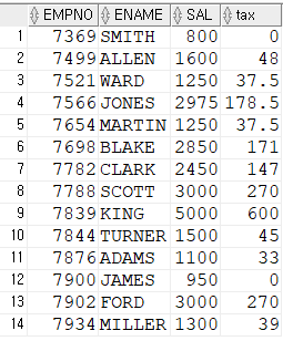 Q. 사원번호, 이름, 급여, 급여의 세금을 출력(decode 와 case when then).