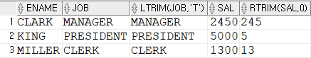 SELECT ename, job, LTRIM(job, 'T'), sal, RTRIM(sal, 0)