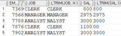 SELECT empno, job, LTRIM(job, 'A'), sal, LTRIM(sal, 1)