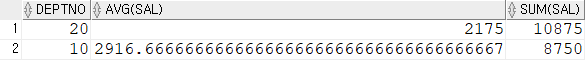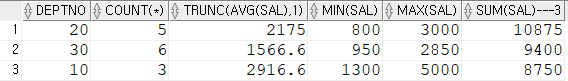 SELECT deptno, count(*), trunc(avg(sal), 1), min(sal), max(sal), sum(sal) ---3